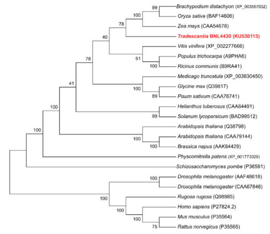 Phylogenetic tree of CNX based on the amino acid sequences from Tradescantia along with plant and non-plant species. A neighbor-joining tree was built using MEGA 4.02. A Dayhoff matrix-based method was used to estimate the branch support. The bootstrap values in branches were obtained by 1000 replications. Species name and accession numbers of CNX proteins represent the sources of CNX proteins in the figure.