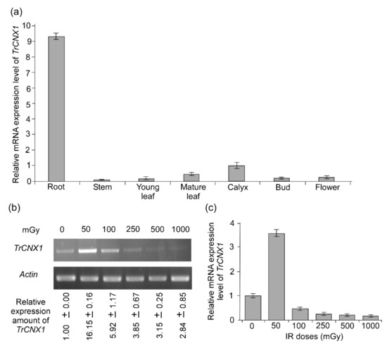mRNA expression analysis of TrCNX1 genes. The relative expression levels of TrCNX1 genes were normalized to that of the actin reference gene. (a) Differential tissue expression of TrCNX1 transcript in Tradescantia. TrCNX1 transcript levels were investigated in seven different tissues via RT-qPCR. Transcriptional levels of calyx were set as control (the value of 1) to estimate expression in different organs. (b) RT-PCR validation of TrCNX1 gene expression levels in response to various doses of gamma irradiation (Ɣ–IR) treatments (50, 250, and 500 mGy for 1 h, and 1000 mGy for 10 h). Lower panels indicate Tradescantia actin gene amplification. Values with ± standard error represent the relative amounts of calculated TrCNX1 expression as described in the Materials and Methods section. (c) Relative mRNA expression levels of TrCNX1 in response to various doses of Ɣ–IR t using RT-qPCR. Transcriptional levels with 0 mGy were set as the control (the value of 1) to determine the expression levels under other treatments.