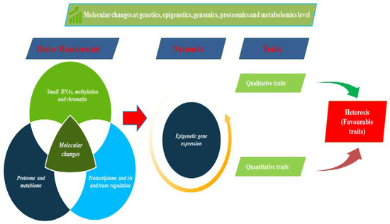 Molecular changes at genetics, epigenetic, genomic, proteomic, and metabolic levels leading to favorable heterosis traits.
