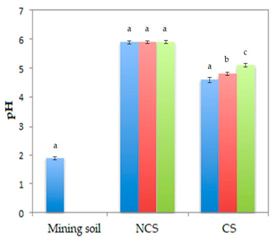pH of the mining soil, NCS and CS at days 0 (blue bars), 30 (red bars) and 90 (green bars). Different letters in the same soil indicate significant differences in the pH value according to Duncan’s multiple range test (p ≤ 0.05).
