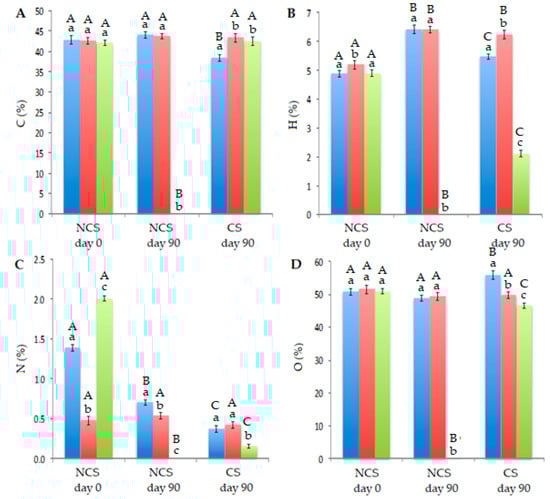 Percentages of carbon (A), hydrogen (B), nitrogen (C) and oxygen (D) in roots (blue bars), stems (red bars) and leaves (green bars) of plants grown in NCS and CS at days 0 and 90. For each element, different lowercase letters in the bars within the same soil indicate significant differences in roots, stems and leaves, while different uppercase letters in roots, stems or leaves indicate significant differences among soils/days, both according to Duncan’s multiple range test (p ≤ 0.05).
