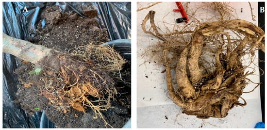 J. curcas L. roots from plants grown in NCS (A) and in CS (B) after 90 days.