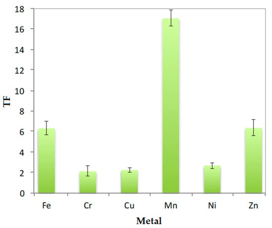 The data obtained for plants grown in the metal-contaminated soil were considered for this discussion, since the growth and metal uptake of J. curcas L. in peat moss was not the aim of this research. High translocation factors were obtained in plants grown in CS (Figure 6). If the aim is to stabilize the metals in the roots so that they do not reach the stem or leaves (phytostabilization) and, therefore, prevent them from entering the ecosystem, TF much lesser than 1 should have been obtained. As can be seen, this fact did not occur for any of the analysed metals.