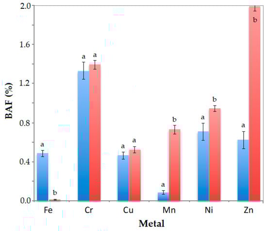 Bioaccumulation factors in roots (blue bars) and aerial parts (red bars) of J. curcas L. after 90 days planted in CS. Different letters in BAF bars of a metal indicate significant differences between BAFroot and BAFaerial according to Duncan’s multiple range test (p ≤ 0.05).