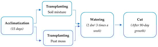 First, the four-year-old J. curcas L. plants were planted in peat moss in 50-cm-pots and placed in the rooftop of the Faculty of Chemistry of the University of Seville on 8th March 2019 to achieve acclimatization to the environment for 15 days. Afterwards, eight plants were transplanted to their corresponding soils. To be specific, four plants were transplanted to 50-cm diameter pots with 6 kg CS, and the other four plants to 50-cm diameter pots containing 6 kg of non-contaminated soil (NCS), i.e., peat moss (Universal Compo Sana substrate, Münster, Germany). The pots were watered three times a week with 2 dm3 of tap water for 90 days. Four plants were cut-up and analysed at day 0. The other eight plants (four planted in NCS and another four planted in CS) were cut-up and analysed at day 90. Soils were analysed at days 0 and 90, i.e., 16 samples, four replicates of each soil at day 0 and another four replicates at day 90. The experimental procedure is summarized in Figure 8.