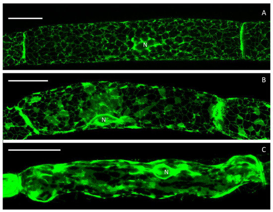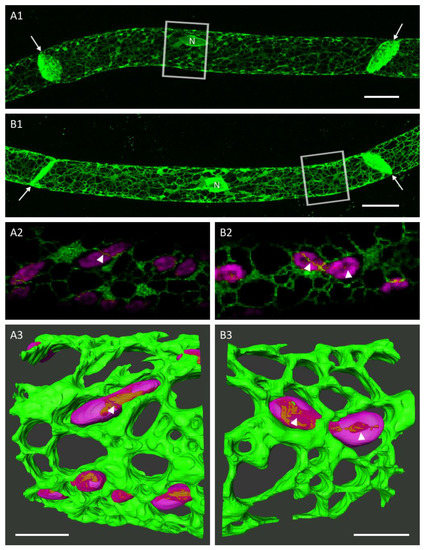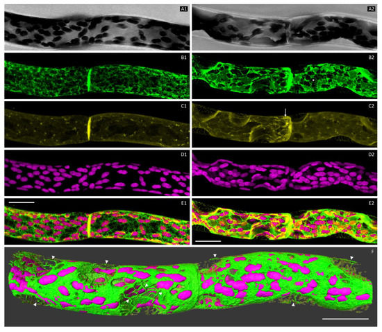 - Suzuki, R.; Nishii, I.; Okada, S.; Noguchi, T. 3D reconstruction of endoplasmic reticulum in a hydrocarbon-secreting green alga, Botryococcus braunii (Race B). Planta 2018, 247, 663–677. [Google Scholar] [CrossRef] [PubMed]