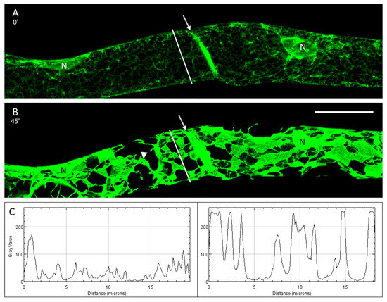 - Oparka, K.J.; Prior, D.A.M.; Crawford, J.W. Behaviour of plasma membrane, cortical ER and plasmodesmata during plasmolysis of onion epidermal cells. Plant. Cell Environ. 1994, 17, 163–171. [Google Scholar] [CrossRef]