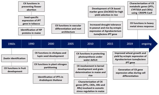 A timeline of key progresses in cytokinin (CK) research [23,24,25,26,27,28,29,30,31,32,33,34,35,36,37,38,39,40,41,42,43,44,45]. HP: Histidine phosphotransfer; IPT: isopentenyl transferase.