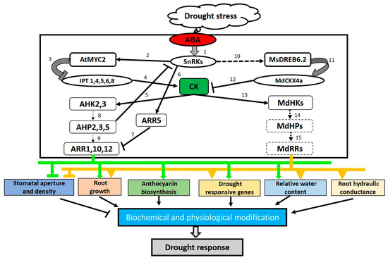 Proposed model of the regulatory functions of cytokinin (CK) signaling pathway in plant drought adaptation. Information for this pathway was suggested from previous studies [116,117]. Numbers represent regulation processes that were found in Arabidopsis (1-9) and apple (10-15). Dashed lines indicate proposed processes that have not been experimentally validated. Arrowheads represent activation, and perpendicular bars indicate inhibition. CK signaling in drought stress response induced by abscisic acid (ABA) can be divided into two unique mechanisms at the cellular level. One is the indirect regulation by ABA-responsive transcription factors [MYC (myeloblastosis) and DREB (dehydration-responsive element binding)] via the CK metabolic gene family members IPTs and CKXs, to initiate the reduction of endogenous CK levels in plant. In the other mechanism, the inhibition of CK action can be induced by ABA-responsive component SnRK2, which directly phosphorylates type-A RR5 (ARR5), a negative regulator of CK signaling. As a result, expression of stress-responsive genes is regulated to confer modifications in physiological and biochemical activities in mediating plant responses to drought conditions.