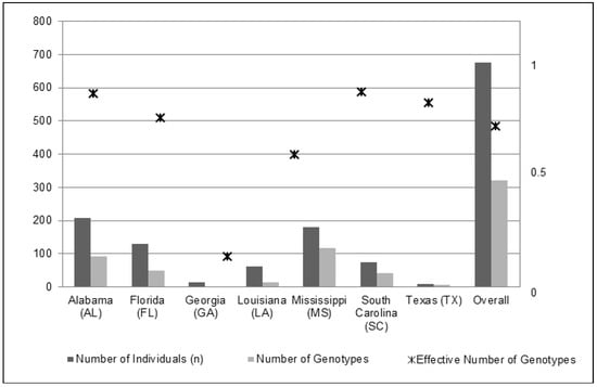 An overall reduction was observed in the clonal diversity analysis from 676 sampled individuals to 321 unique multi-locus genotypes (Table 1 and Figure 1). The mean genotype diversity (range: 0 to 1) for all states was 0.736 (SE ± 0.105). We observed the lowest genotype diversity in GA at 0.154, reducing the effective number of genotypes to 1.154. We observed the highest genotype diversity in MS and AL (>0.90), with FL and SC close behind (0.816 and 0.888, respectively; Table 1 and Figure 1).