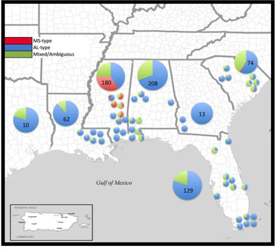 Map of the southern US with the proportion of individuals assigned to MS-type (red), AL-type (blue) or ambiguous (green) based on a 90% threshold of assignment from STRUCTURE.