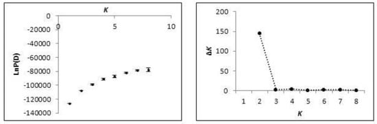 Summary evaluation of the posterior probability values [LnP(D)] used for the determination of the most likely number of clusters (K) from STRUCTURE simulations.