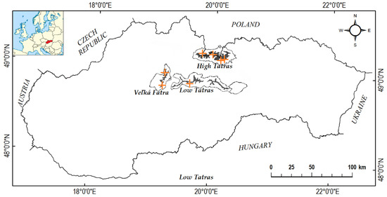 Locations of bilberry collection sites (marked in yellow crosses) in three mountain ranges in Slovakia.