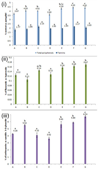 Contents of the phenolic compounds in the bilberry samples: total polyphenols and tannins (i), flavonoids (ii) and anthocyanins (iii). Content is expressed as % of the reference compound of sample dry weight (DW). Different letters (a–c) denote statistically significant differences among growing locations at p < 0.05 (n = 3).