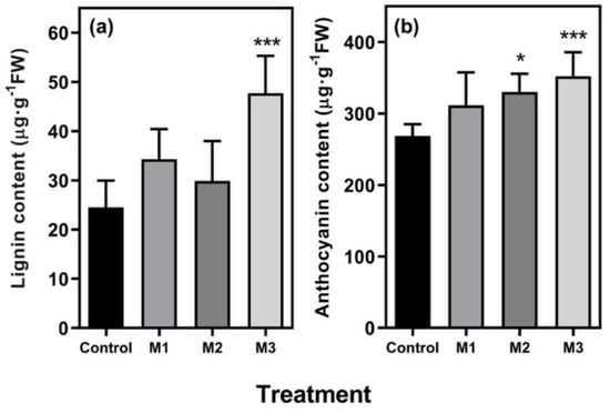 3.3. Analysis of Anthocyanin and Lignin Contents