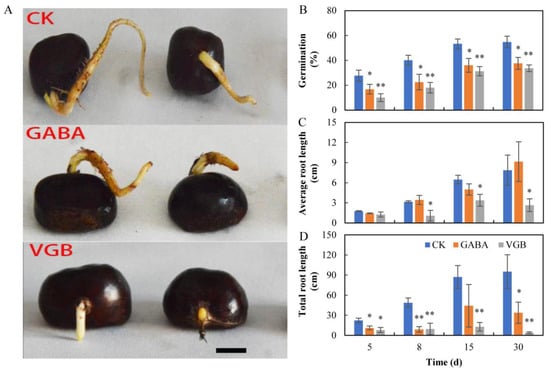 (A) Effects of exogenous GABA and VGB on (B) chestnut seed germination and (C,D) primary root growth. * and ** represent significant differences between the treatments and the control (CK) at p < 0.05 and p < 0.01, respectively.