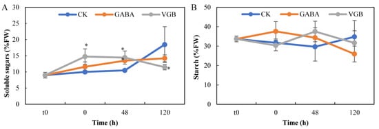 Effects of exogenous GABA and VGB on (A) the soluble sugar and (B) starch contents during chestnut seed germination. * represents a significant difference between the treatments and control (CK) at p < 0.05. t0: time-point when the seed imbibition was initiated.