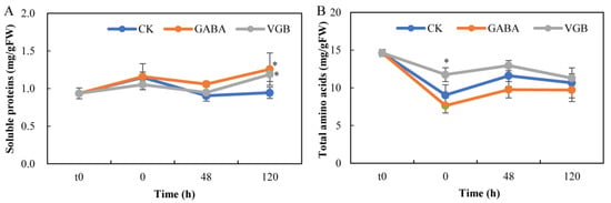 Effects of exogenous GABA and VGB on (A) soluble protein and (B) total amino acid contents during chestnut seed germination. * represents a significant difference between the treatments and control (CK) at p < 0.05. t0: time-point when the seed imbibition was initiated.
