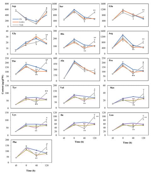 Effects of exogenous GABA and VGB on free amino acid contents during chestnut seed germination. * and ** represent significant differences between the treatments and control (CK) at p < 0.05 and p < 0.01, respectively. t0: time-point when the seed imbibition was initiated.
