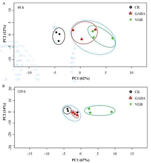 We completed a PCA to explore the effects of GABA and VGB before germination (48 h) (Figure 7A) and after germination (120 h) (Figure 7B). Specifically, the physiological traits of the chestnut seeds were evaluated (Table S1). Our data revealed that PC1 and PC2 accounted for 62% and 12% of the physiological variation before germination (48 h), respectively (Figure 7A). The effects of GABA and VGB were clearly separated from the effects of CK by PC1 at 48 h. Additionally, Ser, Pro, Tyr, Val, Met, and Ile were key contributors to PC1, whereas soluble sugars and total amino acids were important factors for PC2 (Table S1). After germination (120 h), PC1 and PC2 accounted for 67% and 14% of the physiological variation, respectively (Figure 7B). The effects of the VGB treatment were clearly separated from the effects of CK; however, the effects of the GABA treatment and CK were uncovered by PC1. These findings indicated that exogenous GABA and VGB were important for inhibiting chestnut seed germination.