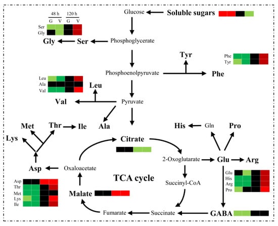 Relative to the CK levels, the soluble protein contents increased in response to exogenous GABA and VGB at 120 h (Figure 5A). In contrast, only VGB increased the total amino acid content (0 h) (Figure 5B). The abundance of the following 12 free amino acids decreased after the GABA and VGB treatments at the 48 h time-point: Ser, His, Arg, Thr, Pro, Tyr, Val, Met, Lys, Ile, Phe, and Leu. At 120 h, only the Asp content was increased by both treatments, whereas the abundance of 13 free amino acids increased only in response to VGB (i.e., Ser, Glu, Gly, His, Arg, Thr, Pro, Tyr, Val, Lys, Ile, Phe, and Leu) (Figure 6). These results implied that the GABA and VGB treatments negatively regulated amino acid metabolism before germination, but after germination, the free amino acid contents were increased mainly by VGB.