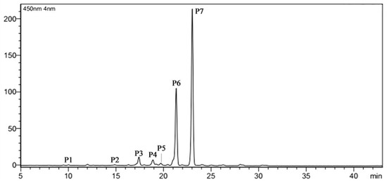 HPLC chromatograms of carotenoid pigments extracted from petals of ‘Yanhonggui’. P1: phytoene. P2: lutein. P3: internal standard β-apo-8′-carotenol. P4: unidentified carotenoid. P5: β-cryptoxanthin. P6: α-carotene. P7: β-carotene.