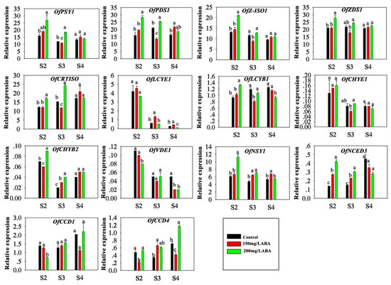 Quantitative real-time PCR analysis of fourteen genes involved in carotenoid matabolism was performed. The OfACT gene was an internal control. At S2 and S3, high ABA treatment (200 mg/L ABA) increased the expression of the upstream genes OfPSY1, OfPDS1, OfZDS1, OfCRTISO, OfCHYB2, OfNSY1 and OfNCED3, which are involved in the biosynthetic pathway of carotenoids, and the transcription levels of OfZ-ISO and OfLCYB1 were only upregulated at S2 with the 200 mg/L ABA treatment. The expression of OfCCD4 was upregulated at S3 and S4. Moreover, not all of the genes mentioned above were affected at other stages by ABA treatment. In contrast, expression of OfCCD1 and OfVDE decreased with the 200 mg/L ABA treatment at S2. Unlike the gene expression patterns found with the 200 mg/L ABA treatment, the application of 150 mg/L ABA only increased the expression of several genes, such as OfCHYB2 and OfCCD4 at S3, OfLCYE1 and OfNSY1 at S3 and S4, and OfNCED3 at S2 and S3. However, the transcript levels of other genes detected with the 150 mg/L ABA treatment were not affected and even decreased in some stages (Figure 2).