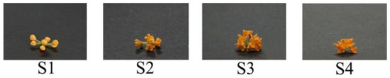 O. fragrans ‘Yanhonggui’ potted plants were grown under greenhouse conditions at Zhejiang A&F University and then were incubated at a constant temperature (25 °C) and relative humidity (70%) before the Linggeng stage (S1: flower buds are similar to round bells). The growth medium was a sterile mixture of peat: vermiculite: perlite (1:1:1). Samples were subjected to 12/12 hour light/dark periods until the treatment was completed. The light intensity inside the incubator was set to 5000 Lux by white fluorescent tubes. Then, 0 mg/L, 150 mg/L and 200 mg/L (±) ABA (Sigma-Aldrich, Shanghai, China) was spread onto the flowers every 24 h from the Linggeng stage (S1). Nine of O. fragrans ‘Yanhonggui’ potted plants with similar heights, and similar amounts of branches and buds were used in this present study. Each treatment contained three O. fragrans ‘Yanhonggui’ potted plants. Flower petals from different branches of same plant at the initial flowering stage (S2: flower petals start to expand), full flowering stage (S3: flower petals are fully open, and the anthers are yellow), and the late flowering stage (S4: flower petals are fully open, and the anthers are brown) [1] (Figure 3) were collected and mixed. At S2 and S3, mixed petals were randomly divided into two groups, part of the petals immediately frozen with liquid nitrogen, and then stored at −80 °C until they were used for gene expression analysis, and the rest was used for the measurement of flower color. At S4, mixed flower petals were randomly divided into three groups, and the first group of petals were immediately frozen with liquid nitrogen, and then stored at −80 °C until they were used for gene expression analysis; the second group of petals was directly frozen after collection by lyophilization in a freeze dryer and stored at −20 °C for carotenoids analysis. The third group of flower petals was used for the measurement of flower color. All nine plants were sampled at every stage.