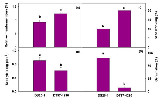 Relative membrane injury in leaves (A), seed yield (B), seed wrinkling (C), and seed germination ability (D) of soybean genotypes DS25-1 and DT97-4290 exposed to heat stress. Relative membrane injury, which is a measure of cell membrane stability, was measured on plants grown under controlled environmental conditions. These plants were exposed to heat stress (38/28 °C) for 7 d during the seedling stage. Seed yield, wrinkling, and germination ability were measured on plants grown under field conditions at Stoneville, MS during April–September 2019. Plants experienced > 35/25 °C (supra-optimal temperatures) on >50 days during the life cycle due to hot weather conditions at Stoneville. Seed yield and wrinkling were measured for plants harvested at growth stage, R8 (full maturity), whereas seed germination ability was measured for plants harvested 14 d after growth stage, R8.