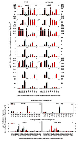 Decrease in the amounts of most unsaturated lipid species (36:6, 36:5, 36:4, 36:3, 34:4, and 34:3 lipids) and increase in the amounts of saturated and less unsaturated lipid species (32:0, 34:1, 34:2, and 36:1 lipids) in the heat-tolerant soybean genotype DS25-1 and absence of these lipid remodeling in the heat-susceptible genotype DT97-4290. Panels A through P show the effects of temperature on plastid-localized (DGDG, MGDG, and PG) and extraplastid-localized (PC, PE, PI, PS, and PA) diacyl lipid molecular species of DS25-1 (left) and DT97-4290 (right). Panel Q through T represent summary panels, which show the effects of temperature on plastid-localized and extraplastid-localized lipid species averaged across headgroup classes. Extraplastid-localized lipids are localized in the endoplasmic reticulum. Values shown are least squares means ± SE. Least squares means with ’*’ are significantly different according to the least significant difference (LSD) test at α = 0.05. Breaks on the y-axis indicate a change in scale. OT, optimal temperature (30/20 °C). HT, high temperature (38/28 °C). DGDG, digalactosyldiacylglycerol. MGDG, monogalactosyldiacylglycerol. PG, phosphatidylglycerol. PC, phosphatidylcholine. PE, phosphatidylethanolamine. PI, phosphatidylinositol. PS, phosphatidylserine. PA, phosphatidic acid. The identities of the lipids indicated as total acyl carbons:total double bonds as molecular species with defined acyl chains are: 32:0 (16:0/16:0), 34:4 (18:3/16:1), 34:3 (most likely 16:0/18:3), 34:2 (16:1/18:1 or 16:0/18:2), 34:1 (16:0/18:1), 36:6 (18:3/18:3), 36:5 (18:2/18:3), 36:4 (18:2/18:2 or 18:1/18:3), 36:3 (most likely 18:0/18:3), and 36:1 (18:0/18:1) [29].