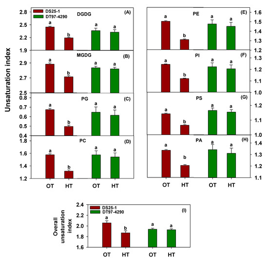 Decrease in unsaturation index under heat stress in the heat-tolerant soybean genotype DS25-1 and no change in unsaturation index under heat stress in the heat-susceptible genotype DT97-4290. Panels A through H show the effects of temperature on unsaturation index of various lipid head group classes (DGDG, MGDG, PG, PC, PE, PI, PS, and PA). Panel I shows the effect of temperature on overall unsaturation index. The unsaturation index of each lipid molecular species was calculated as the average number of double bonds per acyl chain, which is the number of double bonds in the lipid molecular species divided by the number of acyl chains. The unsaturation index of a lipid head group class was calculated as the [sum of (the unsaturation indices of individual lipid molecular species in that class times the amount of each species)] divided by the sum of the amount of lipid molecular species in the class. Values shown are least squares means ± SE. Least squares means with different letters are significantly different according to the least significant difference (LSD) test at α = 0.05. Comparisons have been done between temperature treatments within each genotype. OT, optimal temperature (30/20 °C). HT, high temperature (38/28 °C). DGDG, digalactosyldiacylglycerol. MGDG, monogalactosyldiacylglycerol. PG, phosphatidylglycerol. PC, phosphatidylcholine. PE, phosphatidylethanolamine. PI, phosphatidylinositol. PS, phosphatidylserine. PA, phosphatidic acid.