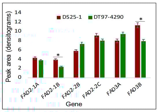 Expression analysis of the Fatty Acid Desaturase (FAD) genes under optimal temperature conditions in the leaf samples (26 days old) of a heat-tolerant soybean genotype DS25-1 and heat-susceptible soybean genotype DT97-4290. The two soybean genotypes did not show any significant differences in the expression pattern of the FAD2-1A, FAD2-2B, FAD2-2C, and FAD3A genes under optimal temperature conditions (30/20 °C). The asterisk signifies a significant difference in the expression level of the FAD genes in the two soybean genotypes. Semi-quantitative reverse transcription-polymerase chain reactions (RT-PCRs) were performed using gene-specific primers [24], except for the FAD3A and FAD3B genes. The FAD3A and FAD3B genes were amplified together using a primer pair, and the two transcripts were discriminated via restriction digestion of the amplified fragment with the Van91I enzyme [25,27] (see Table S1 for primer details and PCR conditions). Following PCR, products were loaded onto agarose gel and the gel images were used for densitometric analysis. In all cases, gene expression results were normalized to the expression of the housekeeping gene. The Student’s t-test was used to compare the expression levels of the FAD genes in DS25-1 and DT97-4290. The error bars signify the standard error.