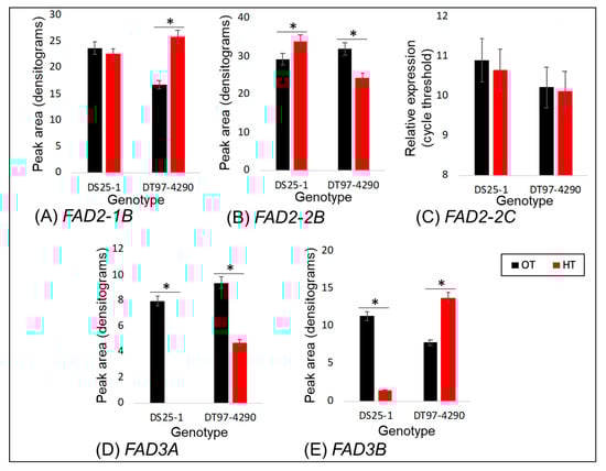Under heat stress conditions (38/28 °C), significant changes in the expression levels of the FAD3A (expression undetectable, Figure 5D), FAD3B (89% decline, Figure 5E), and FAD2-2B (16% increase, Figure 5A) genes were observed in the case of DS25-1. However, no significant variation was observed in the expression patterns of the FAD2-1B and FAD2-2C genes in this genotype (Figure 5B,D). On the other hand, in DT97-4290, the FAD3A gene showed a 50% decline in expression level under heat stress, the FAD3B gene, a 43% increase, the FAD2-1B gene, a 35% increase, and the FAD2-2B gene, a 24% decline. As in DS25-1, in DT97-4290, changes in the expression level of the FAD2-2C gene with temperature was not significant. The results are consistent with the lipid profiling data in that DT97-4290 did not exhibit the decline in expression of FAD3B (whose product forms 18:3), as observed for DS25-1, nor was the level of expression of FAD3A (whose product also forms 18:3) lowered in DT97-4290 as much as in DS25-1. Thus, the greater reduction in expression levels of FAD3s in DS25-1 as a function of high temperature is consistent with the reduction in the content of 18:3 lipids observed only in DS25-1.