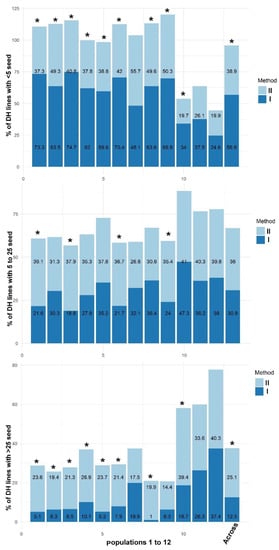 In addition to rates, seed quantity on DH ears resulting from each method was analyzed (Figure 1). A total of 4339 and 791 DH lines were obtained from haploids subjected to Method II and Method I, respectively. Across populations, the proportion of DH lines containing less than five seeds was almost 1.5 times less when using Method II compared to Method I. Among the 12 populations, nine populations showed a significantly lower proportion of DH lines with less than five seeds when using Method II compared to Method I. Additionally, the proportion of DH lines having more than 25 seeds across populations was more than double in Method II compared to Method I. Among the 12 populations, eight populations showed a significantly higher proportion of DH lines with >25 seeds from Method II compared to Method I. There was no significant difference in proportion of DH lines having 5–25 seeds among the two methods. In summary, Method II resulted in greater recovery of DH lines (D1 ears) with higher seed quantity compared to Method I.