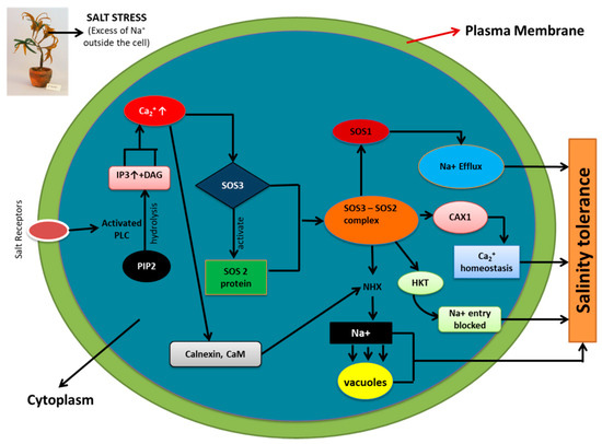 Calcium is also considered to be in the epicenter of regulation of signaling pathways during salinity stress. The condition of salinity stress leads to an increase in the cytosolic Ca2+, leading to the activation of signal transduction pathways for tolerance towards salinity stress. Ca2+ release is stipulated to be due to two major events [94]. One event involves the activity of EGTA or BAPTA in blocking the calcineurin-mediated activity leading to release of Ca2+ ions form an extracellular source (apoplast). The other event involves the Phospholipase C activation; as a result, phosphatidylinositol bisphosphate is hydrolyzed into inositol trisphosphate, leading to release of Ca2+ from intracellular Ca2+ stores. A level up in calcium signaling is seen due to the presence of calcium sensors which detect the calcium signatures, decode them and process the information downstream leading to phosphorylation cascade initiation and gene expression [94].