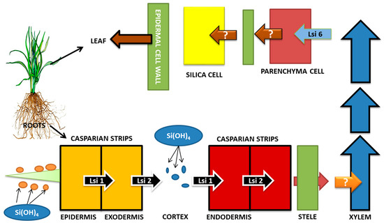 Soil generally contains Si in amounts of about 50 to 400 g Si kg−1 [110]. About 50%–70% of soil mass has Si present in it in the form of SiO2 and other aluminosilicate forms [23]. Despite the abundance of Si in soil, its uptake by plants is very low due to the poor solubility of Si compounds present in soil [111,112,113]. Factors such as pH of soil, water content, cations, and organic compounds that are present in soil greatly influence the solubilization of Si in soil [114]. The PAFs (plant available forms) of silicon, such as silicic acid or mono silicic acid [Si(OH)4 or H4SiO4], are generally taken up by plants. The range of PAF-Si concentration in soil varies from 10 ppm to 100 ppm [115]. At physiological pH, Si in the form of silicic acid or mono silicic acid can cross the plasma membrane [116]. In soil solution, silicic acid is found at concentrations of 0.1 to 0.6 mM at a pH below 9 [117]. Si concentrations in leaves range from 0.1% to 10% on the basis of dry weight [118,119]. The variation in concentration of Si among species is found to be higher than variation within species [120]. The reason behind variations in accumulation of Si in plants lies in the differential abilities of Si uptake by roots [121]. Byrophyta, Lycopsida, and Equisetopsids are found to accumulate Si in higher concentrations, whereas Filicopsida, gymnosperms, and angiosperms accumulate Si in very low concentrations [26,122]. The cyperaceae, poaceae, and balsaminaceae, which are taxa of angiosperms, accumulate > 4% of Si; 2%–4% of Si accumulation is seen in cucurbitales, urticales, and commenlinaceae, but Solanaceae and Fabaceae are considered to be Si excluders [26,122]. On the basis of water uptake capacity in higher plants, the adsorption of Si at lateral roots can be segregated in three ways: active uptake (uptake of Si is faster than uptake of water). Passive uptake (rate of water uptake and Si uptake is the same) and rejective uptake (uptake of Si is slow as compared to uptake of water) [123,124]. The apoplastic and symplastic routes are used for the uptake of silicic acid by root. NIPs (Nod26-like intrinsic protein), which are a class of the aquaporin (AQP) gene family, are responsible for the symplastic route of Si uptake by roots. Several monocots and dicots have Si transporter AQPs present in them [125,126,127,128,129]. The horsetail, which is a primitive plant species, is considered to be the “king of Si accumulators” [130,131].