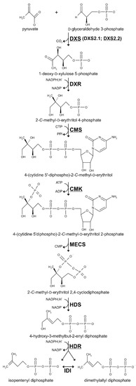 The 2-C-methyl-D-erythritol 4-phosphate (MEP) pathway yielding isopentenyl diphosphate (IPP) and its allylic isomer dimethylallyl diphosphate (DMAPP). DXS, 1-deoxy-D-xylulose 5-phosphate synthase; DXR, 1-deoxy-D-xylulose 5-phosphate reductoisomerase; CMS, 2-C-methyl-D-erythritol 4-phosphate synthase; CMK, 4-(cytidine 5′diphospho)-2-C-methyl-D-erythritol kinase; MECS, 2-C-methyl-D-erythritol 2,4-cyclodiphosphate synthase; HDS, (E)-4-hydroxy-3-methylbut-2-enyl diphosphate synthase; HDR, (E)-4-hydroxy-3-methylbut-2-enyl diphosphate reductase; IDI, isopentenyl diphosphate isomerase.