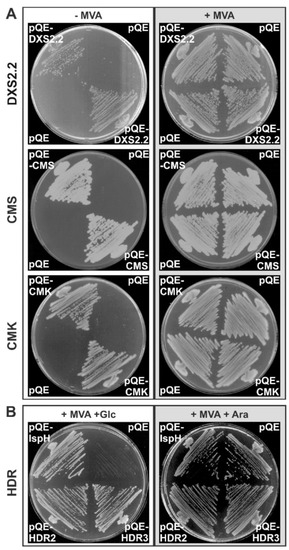 Based on ChloroP predictions of plastid transit length (Table 1), truncated cDNA of DXS2.2, CMS, CMK and HDR were amplified as described in Table S2, allowing for removal of the predicted transit peptide and to introduce restriction sites at both cDNA ends. Amplifications were performed using Pfu DNA polymerase (Promega) and the corresponding PCR products were cloned into pQE-30 (Qiagen, Courtaboeuf, France). After sequencing, the plasmids expressing the pseudomature form of DXS2.2, CMS, CMK and HDR were used in bacterial complementation assays as described in Table S2 and according to the procedures described by [42,43].