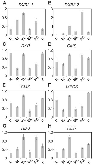 Expressing pattern of MEP pathway genes in different C. roseus organs. Total RNA was extracted from the root (R), young leaves (YL), mature leaves (ML), first internodes (IN), flower buds (FB) and mature flower (F), and subjected to reverse transcription. Transcript levels for MEP pathway genes and RPS9 were determined by real-time PCR using gene-specific primers. MEP pathway gene expression levels were normalized using RPS9. The transcript level of young leaves was individually set to “1” for the eight genes. (A) DXS2.1; (B) DXS2.2; (C) DXR; (D) CMS; (E) CMK; (F) MECS; (G) HDS; (H) HDR.
