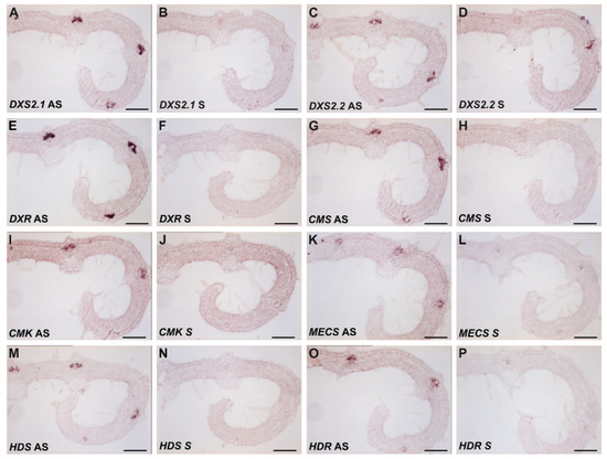 Subsequently, we performed in situ RNA hybridization of DXS2.2, CMS, CMK and HDR transcripts on serial sections of young developing leaves, with DXS2.1, DXR, MECS and HDS as controls (Figure 4). Using the antisense probes, the transcripts of the four genes were specifically detected in the adaxial part of the vascular region, corresponding to IPAP cells (Figure 4C,G,I,O). Such signal was also observed for DXS2.1, DXR, MECS, HDS transcripts as previously established (Figure 4A,E,K,M; [32,35,45,46]) as well as for IDI transcripts analyzed on the same sample [34]. No significant background was observed with the corresponding sense probes (Figure 4B,D,F,H,J,L,N,P). This thus confirms the previous colocalization of DXS2.1, DXR, MECS and HDS transcripts and extends it to the herein identified gene transcripts DXS2.2, CMS, CMK and HDR transcripts. Taken together, these results thus highlight IPAP as the main site of coexpression of genes of the MEP pathway.