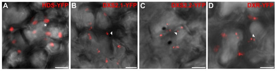 The subcellular localization of C. roseus MEP pathway enzymes was then analyzed through a fluorescent protein (FP) imaging procedure recently developed for C. roseus cell cultures [47,48]. The full-length sequence of each enzyme was fused to the N-terminal end of green FP (GFP) to express a MEP enzyme-GFP fusion maintaining accessibility of the predicted TP. The resulting proteins were transiently expressed in C. roseus chlorophyll-containing cells for imaging. Depending on enzymes, two different patterns of fluorescence were observed (Figure 5). From CMS to HDR, all enzyme fusions displayed a GFP fluorescence signal colocalizing with the autofluorescence of chlorophylls, demonstrating that these enzymes were targeted to plastids (Figure 5D1–H4). The signal appeared diffused into the stroma, as well as the stromules as previously reported for HDS and IDI [34,36]. In contrast, the two first steps of the MEP pathway, including DXS2.1, DXS2.2 and DXR, displayed a GFP fluorescence signal in punctuated aggregates within plastids (Figure 5A1–C4). Although diffuse fluorescence signals were also observed in plastid stroma of a few numbers of cells, the punctuated aggregates were detected in around 95% of the observed cells for both DXS and DXR. To determine whether this punctuated localization depended on the cell type used for localization, we also performed biolistic-mediated transient transformations of cells from detached C. roseus leaves. In these cells, while HDS-Yellow FP (YFP) exhibited a diffuse signal in plastids, both DXS isoforms and DXR YFP fusions still displayed a punctuated fluorescence signal in plastids (Figure 6A–D). Such a protein distribution observed in different cell types was intriguing and raised the question of possible subplastidial targeting of DXS and DXR.