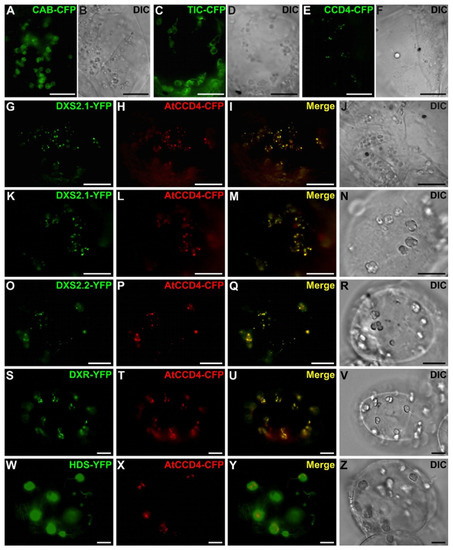 To identify a potential plastid subcompartment hosting DXS2.1-, DXS2.2- and DXR-YFP fusions, we performed cell transformations with distinct markers targeted to thylakoids (CAB-CFP; Figure 9A,B), the inner membrane of plastid envelope (TIC-CFP; Figure 9C,D) and plastoglobuli (CCD4-CFP; Figure 9E,F). While thylakoid and inner membrane markers exhibited circular fluorescent signals in plastids, the plastoglobuli marker displayed a punctuated signal similar to that of DXS2.1, DXS2.2 and DXR fusion proteins. However, cotransformations of cells with plasmids expressing this marker (CCD4-CFP) or DXS2.1, DXS2.2, DXR, HDS-YFP did not reveal a perfect superimposition of the two fluorescent signals, preventing us to firmly conclude on a potential targeting of MEP pathway enzyme to plastoglobuli (Figure 9G–Z).