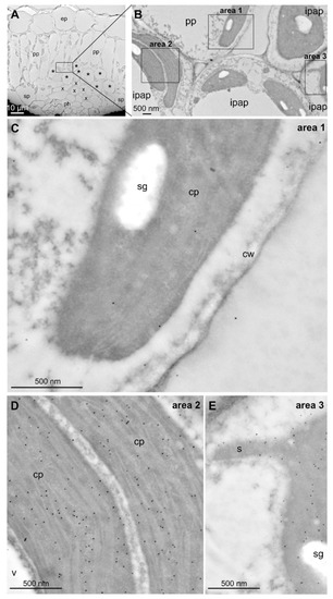 Immunogold labeling of DXR in the stroma of plastids from C. roseus leaf cells. (A) Morphology of C. roseus young leaves observed on ultrathin cross-sections highlighting epidermis (ep), palissadic parenchyma (pp), spongy parenchyma (sp), xylem (x), phloem (ph) and internal phloem associated parenchyma (* or ipap). (B) Intermediate magnification highlighting plastids from pp and ipap. (C) A very low abundant—but specific—labeling was observed in the stroma of palissadic parenchyma plastids neighboring ipap cells. (D,E) Typical dense labeling was specifically observed in the stroma of ipap plastids devoid of plastoglobuli-like structures but including stromule budding (s). cp, chloroplast; cw, cell wall; sg, starch granule.