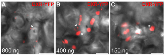 Interestingly, a homogenous immunogold labeling was observed in the stroma of all observed plastids that never displayed plastoglobluli-like structures (Figure 10D,E) but could show some stromule budding including labeling (Figure 10E). Such an absence of the aggregated localization observed through the GFP imaging procedure strongly suggested that it might result from the procedure of protein expression in cells and notably the strong gene overexpression caused by the use of the CaMV35S promoter. To test this hypothesis, additional transformations of the construct expressing the DXR-YFP fusion were performed in cells of C. roseus young leaves using a decreasing amount of transforming plasmid DNA. Interestingly, while using high amount of transforming DNA (800 ng per transformation) still resulted in the observation of a punctuated pattern of localization (Figure 11A), lowering bombarded DNA (400 and 150 ng) led to the progressive fading of this localization pattern up to a complete diffuse distribution in plastid stroma (Figure 11B,C). These results therefore confirm the localization of DXR observed through immunolabeling and suggest that DXR is mainly diffuse in plastid stroma. Additionally, these results also support the idea that an artifactual DXS/DXR localization could be caused by gene overexpression.