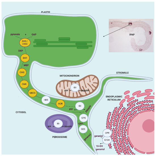 Schematic representation of the cellular and subcellular organization of the MEP pathway and early stage of the monoterpene seco-iridoid (MSI) pathway in C. roseus leaves. The enzymes characterized in this study are highlighted in yellow. IDI (type I IPP isomerase) displayed a triple subcellular targeting in stroma/stromules of plastids, mitochondria and peroxisomes as established [34]. The proximity between stromules and the endoplasmic reticulum facilitates export of geraniol in the close environment of G10H to increase hydroxylation rate. DXS, 1-deoxy-D-xylulose 5-phosphate synthase; DXR, 1-deoxy-D-xylulose 5-phosphate reductoisomerase; CMS, 2-C-methyl-D-erythritol 4-phosphate synthase; CMK, 4-(cytidine 5′diphospho)-2-C-methyl-D-erythritol kinase; MECS, 2-C-methyl-D-erythritol 2,4-cyclodiphosphate synthase; HDS, (E)-4-hydroxy-3-methylbut-2-enyl diphosphate synthase; HDR, (E)-4-hydroxy-3-methylbut-2-enyl diphosphate reductase; IDI, isopentenyl diphosphate isomerase. GPS, geranyl diphosphate synthase. GES, geraniol synthase. CPR, cytochrome P450 reductase. G10H, geraniol 10-hydroxylase. IPAP, internal phloem associated parenchyma. GAP, glyceraldehyde 3-phosphate. DXP, 1-deoxy-D-xylulose 5-phosphate. MEP, 2-C-methyl-D-erythritol 4-phosphate. IPP, isopentenyl diphosphate. DMAPP, dimethylallyl diphosphate. GPP, geranyl diphosphate. Created with Biorender.com.