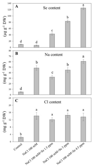 Salt stress did not affect Se accumulation, but exogenous Se fertilization significantly enhanced Se uptake in leaves of black gram (Figure 1A). For all exogenous Se treatments, the highest Se accumulation (125.133 µg g−1 DW) was observed in treatment (NaCl 100 mM + Se 4.5 ppm), second (83.233 µg g−1 DW) in treatment (NaCl 100 mM + Se 3 ppm), and lowest (42.667 µg g−1 DW) in treatment (NaCl 100 mM + Se 1.5 ppm), which showed a progressive trend in Se accumulation with an increase in its applied concentrations (Figure 1A). The application of NaCl significantly increased Na uptake in leaves (Figure 1B). In combined applications of Se and NaCl, only a lower concentration of Se (1.5 ppm) significantly restricted Na accumulation in leaves; the three ppm of Se had no significant effect on Na uptake. In comparison, the higher level (4.5 ppm) significantly increased Na accumulation in leaves of black gram. As compared to the control, salt stress and salt stress combined with exogenous Se (1.5, 3, and 4.5 ppm) application induced significant increases in Cl accumulation, but no significance in Cl uptake were observed among these four treatments (NaCl, NaCl + 1.5 ppm Se, NaCl +3 ppm Se, and NaCl+4.5 ppm Se) (Figure 1C).