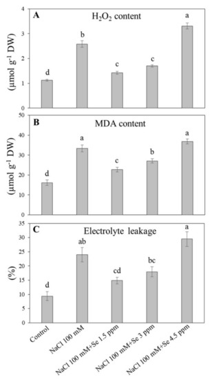 Effect of selenium (Se) fertilization on (A) hydrogen peroxide (H2O2); (B) malondialdehyde (MDA) content; and (C) electrolyte leakage (EL) in leaves of black gram plants under salt stress. Values are mean ± standard error (n = 3). Different letters in vertical columns show a significant difference. A comparison of mean was confirmed by LSD at p < 0.05.