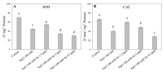 Effect of selenium (Se) fertilization on (A) superoxide dismutase (SOD) and (B) catalase (CAT) activities in leaves of black gram plants under salt stress. Values are mean ± standard error (n = 3). Different letters in vertical columns show a significant difference between each treatment. A comparison of mean was confirmed by LSD at p < 0.05.