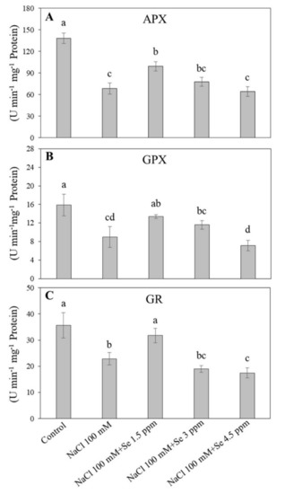 Effect of selenium (Se) fertilization on (A) ascorbate peroxidase (APX); (B) glutathione peroxidase (GPX); and (C) glutathione reductase (GR) in leaves of black gram plants under salt stress. Values are mean ± standard error (n = 3). Different letters in vertical columns show a significant difference. A comparison of mean was confirmed by LSD at p < 0.05.
