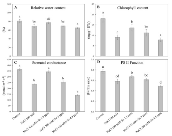 Leaf samples were washed with deionized water, blotted to eliminate extra water, and then dried in an oven. Dried samples were thoroughly homogenized with mortar and pestle, shifted to a digestion flask consisting of ten milliliters of 4 M HNO3, and placed at room temperature overnight. After being heated at 125 °C for 4 hrs, solutions were diluted (50 mL) and cooled for further measurements. The Se concentration (µg g−1 DW) was measured in triplicate using atomic absorption spectrometry [43]. For Na and Cl determination, samples were dried and ground to powder form, and then shifted to an Erlenmeyer flask containing 6 mL of HClO4 and HNO3 solution. The flasks were placed for 30 min at 40 °C in a water bath until condensed to 1 milliliter extract by heating at 150 to 180 °C. Distilled water was used to dissolve this residue to the final volume of 100 mL. The Na concentration in the leaf samples was estimated by using flame photometry, whereas Cl- was determined by precipitation titration with Ag2NO3 following Mohr’s method [44].